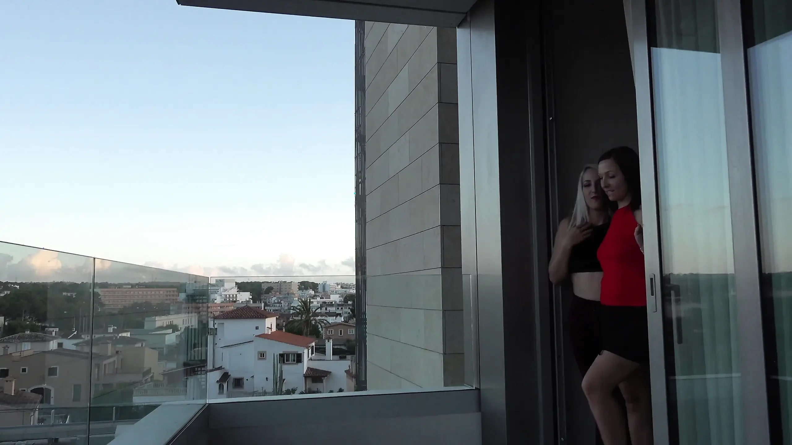 Redhead babe and her blonde friend suck big pecker outdoors in POV action.