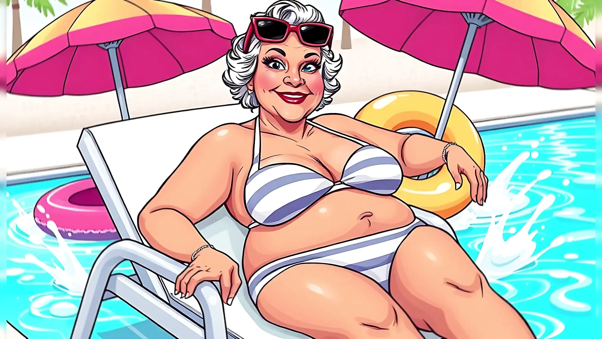 Classic cartoon style featuring mature cleavage and grey hair grannies. Lots of different women depicted in this AI art slideshow.