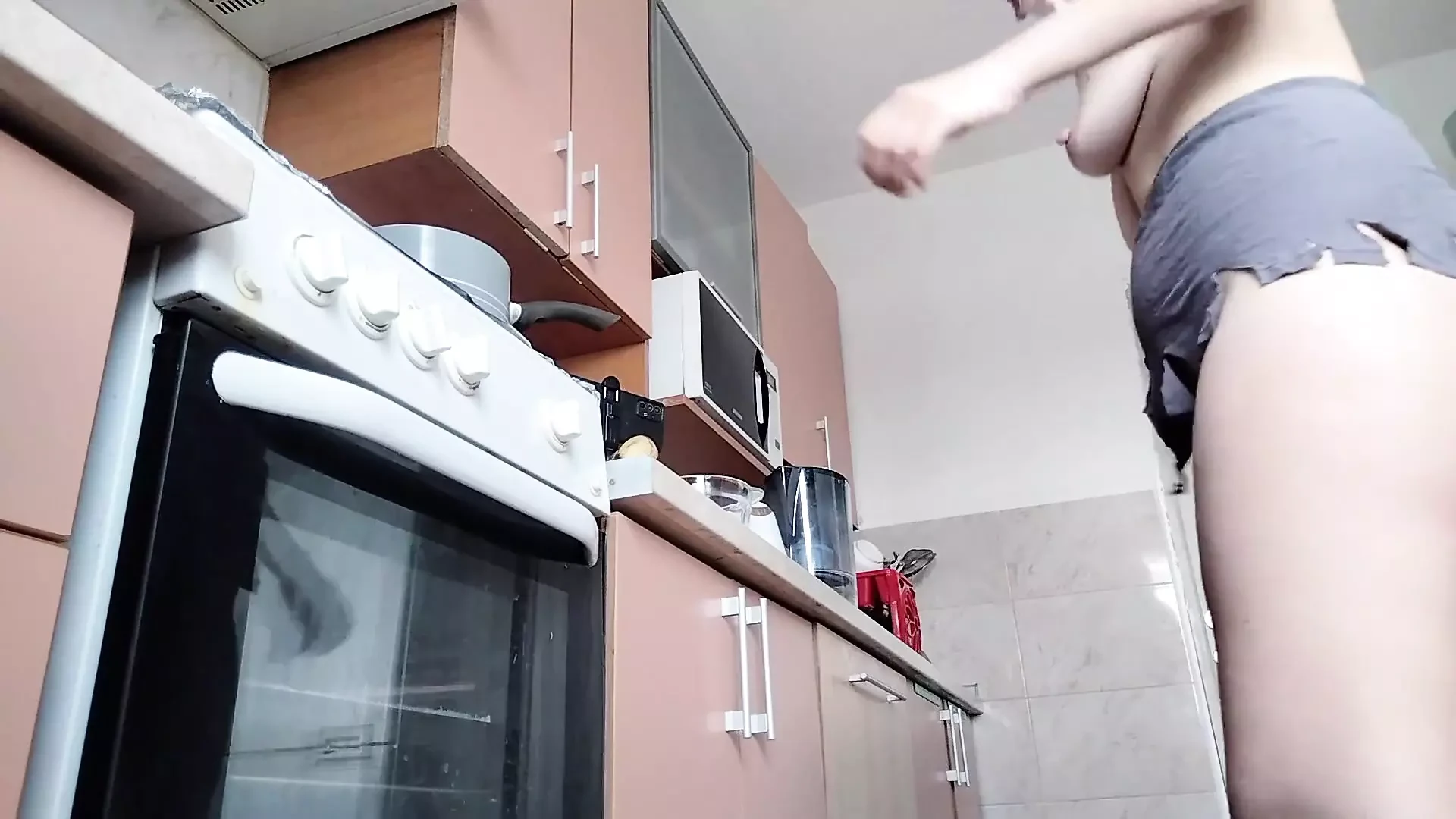 Sexy Naked Wife Preparing Food in the Kitchen. Hairy Brunette, Big Ass, Big Tits.